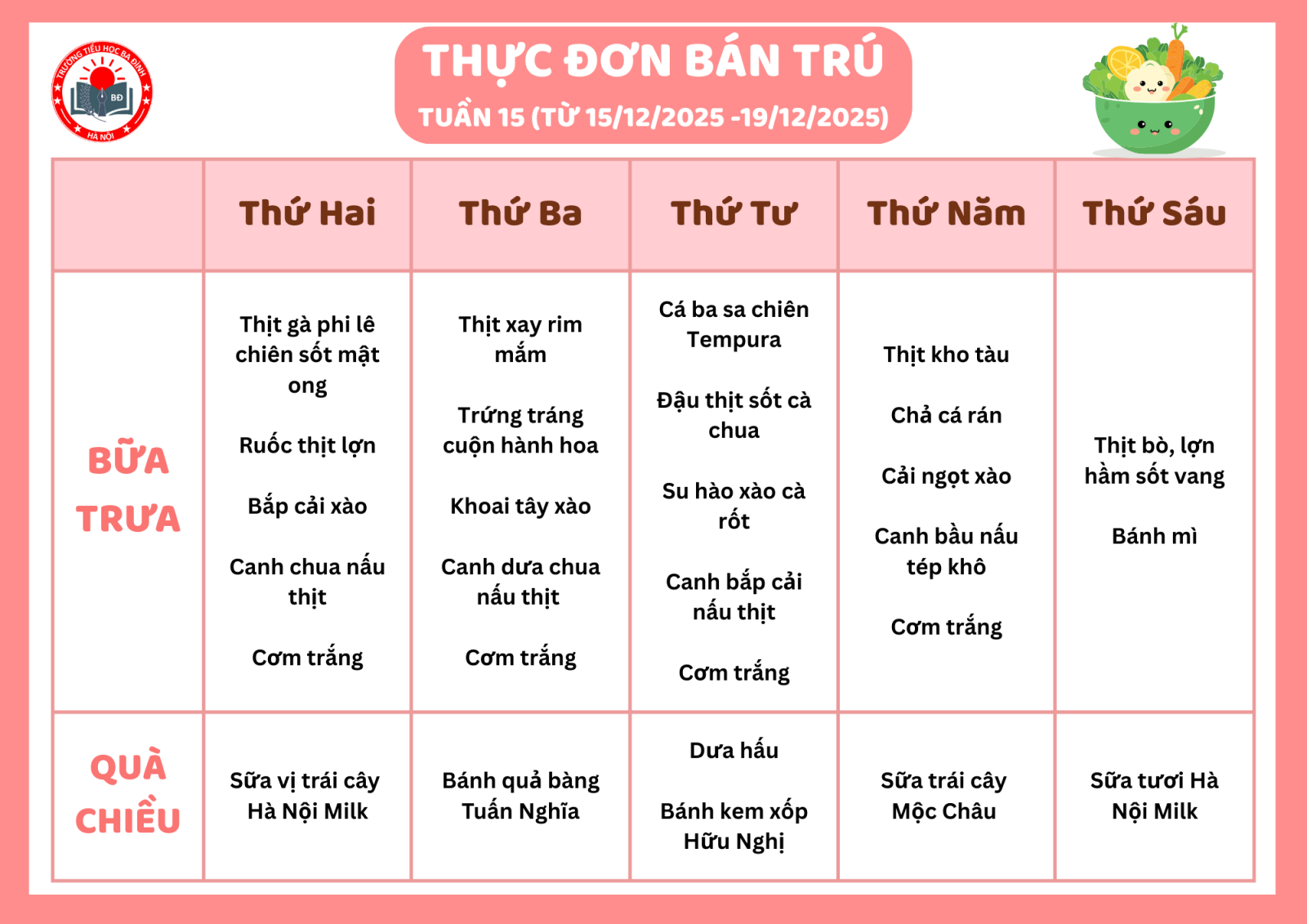 Thực đơn tuần 15 (áp dụng từ 15/12/2025 đến 19/12/2025)