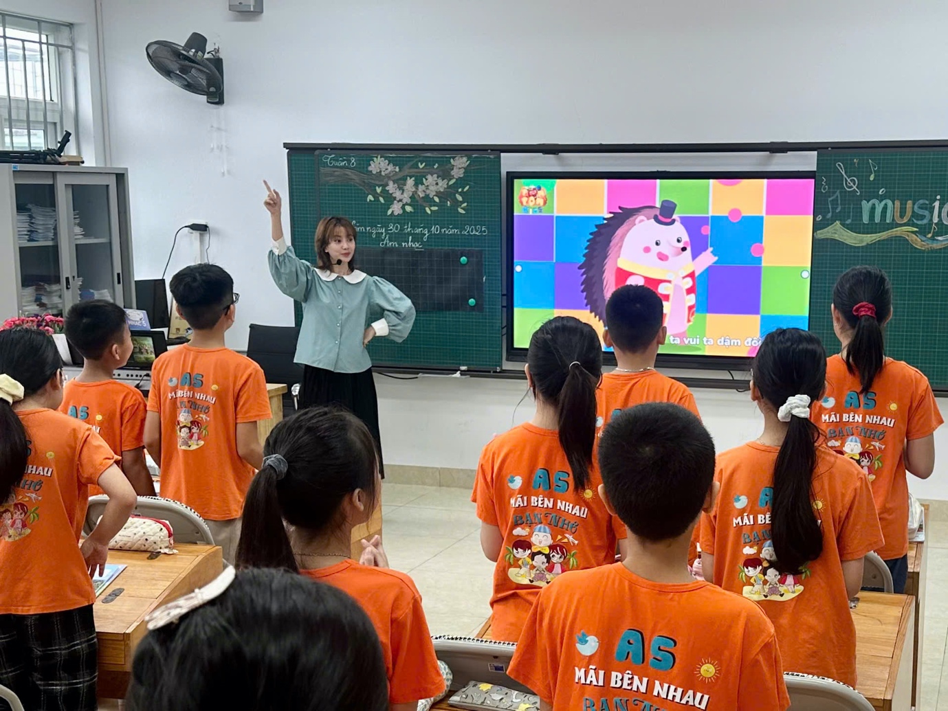 Mở đầu tiết dạy, cô Minh Hằng đã khơi gợi cảm hứng cho học sinh thông qua hoạt động khởi động vui nhộn, tạo không khí sôi nổi và gắn kết. Các em nhanh chóng hòa mình vào không gian âm nhạc đầy hứng khởi.