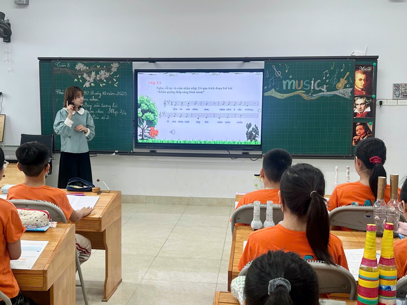 Sáng ngày 30/10/2025, Trường Tiểu học Ba Đình đã tổ chức thành công tiết chuyên đề môn Âm nhạc, do cô giáo Nguyễn Minh Hằng thực hiện với sự tham gia của tập thể học sinh lớp 5A5. Tiết học tập trung vào Chủ đề 3: Bay vào tương lai, gồm các nội dung trọng tâm: Lý thuyết Âm nhạc – Nhịp 2/4 và Đọc nhạc – Bài số 2.