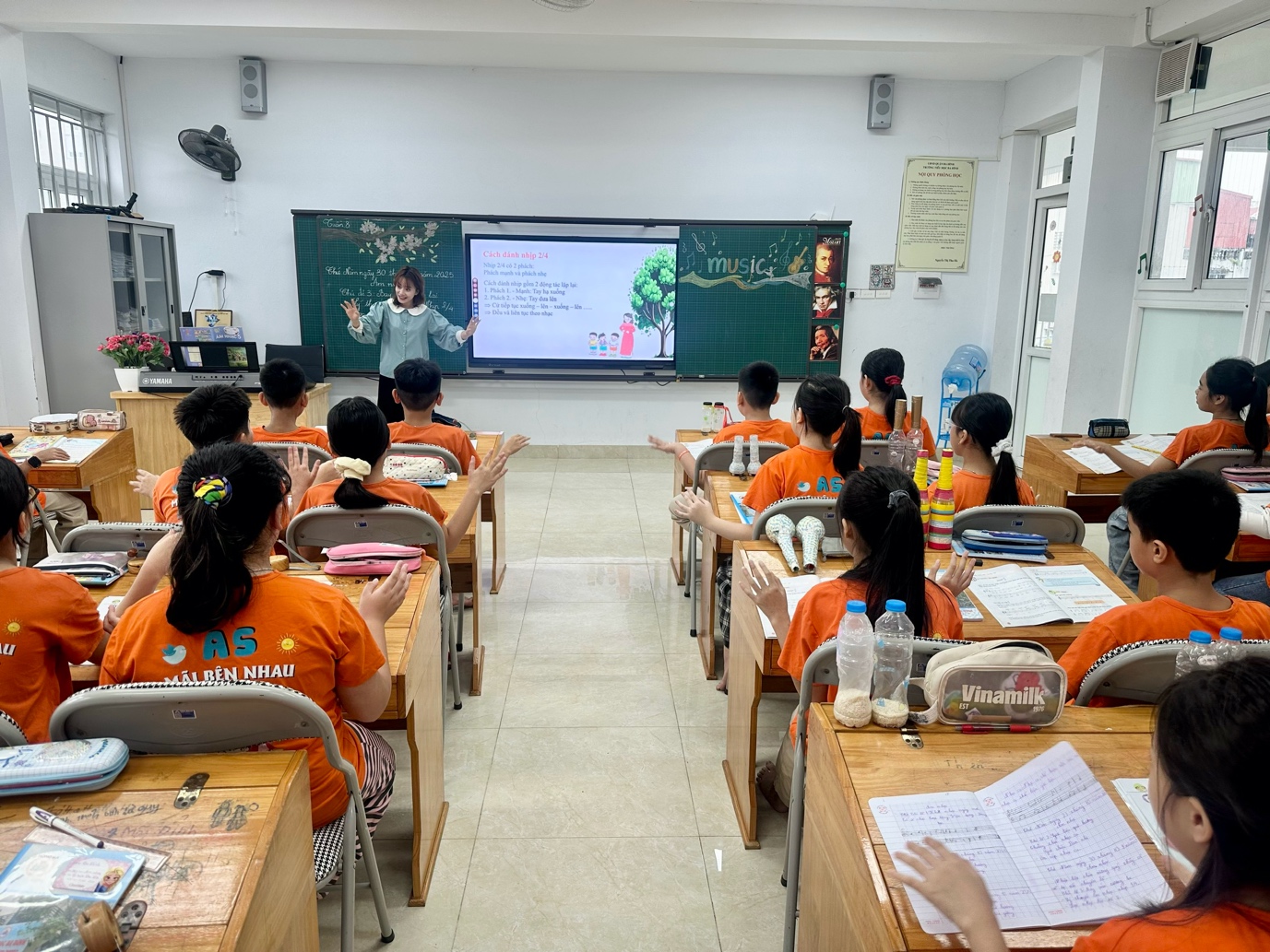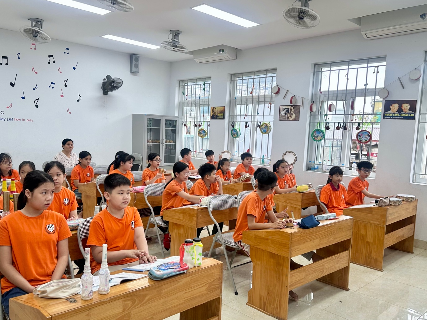 Trong suốt tiết chuyên đề, cô Minh Hằng đã linh hoạt lồng ghép việc sử dụng các nhạc cụ gõ như Maracat và Temorin. Hoạt động này không chỉ giúp học sinh cảm thụ tiết tấu tốt hơn mà còn phát triển kỹ năng phối hợp nhịp nhàng giữa kèn phím và nhạc cụ gõ. Các màn trình diễn sinh động đã mang lại bầu không khí tươi vui, đầy tính sáng tạo và nghệ thuật.