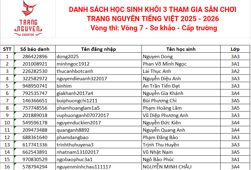 Danh sách học sinh Khối 3 tham gia Sân chơi Trạng nguyên Tiếng Việt 2025 - 2026 - Vòng Sơ khảo - Cấp trường