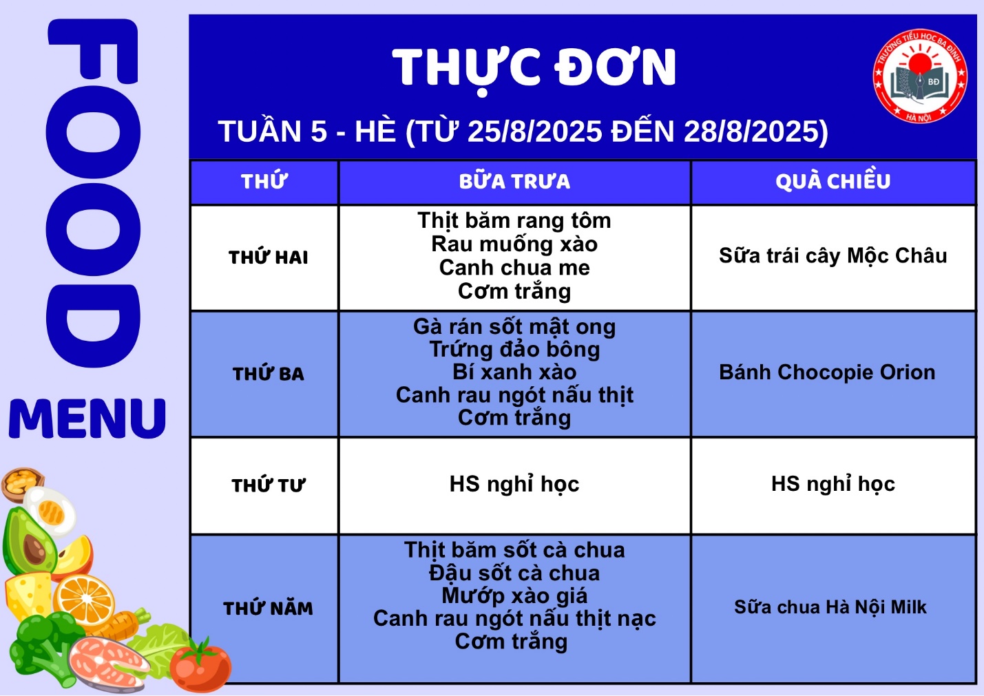 Thực đơn tuần 5 - Hè (áp dụng từ 25/8/2025 đến 28/8/2025)
