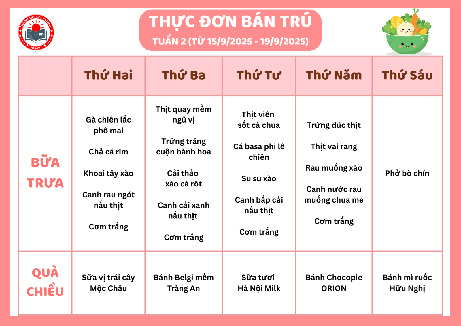 Thực đơn tuần 2 (áp dụng từ 15/9/2025 đến 19/9/2025)