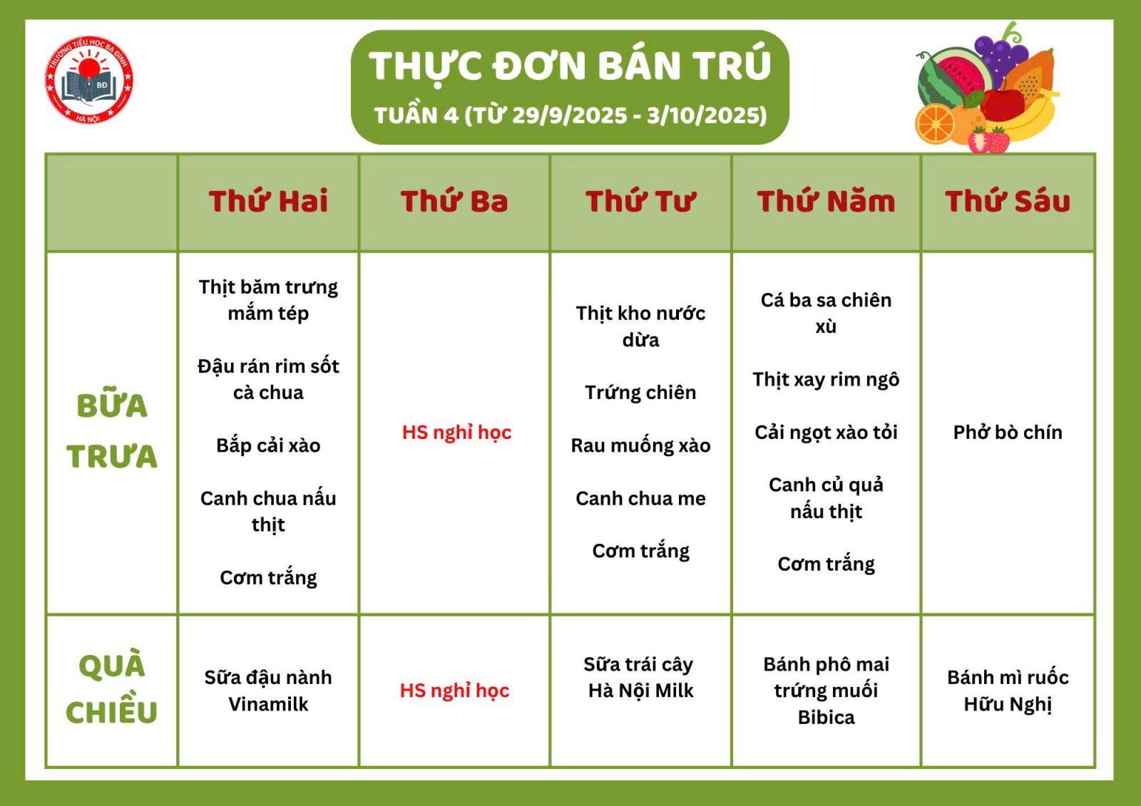 Thực đơn tuần 4 (áp dụng từ 29/9/2025 đến 3/10/2025)