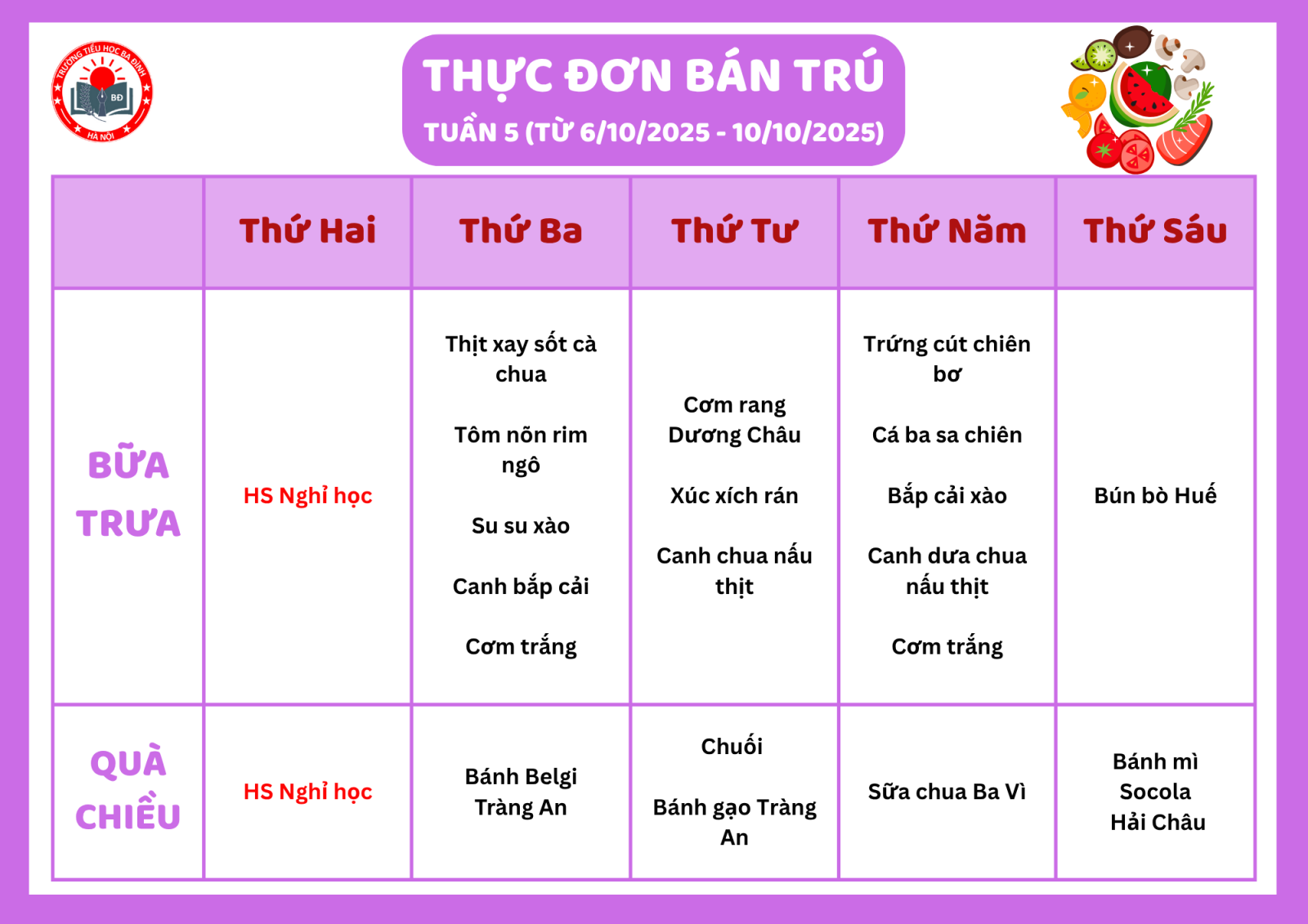 Thực đơn tuần 5 (áp dụng từ 6/10/2025 đến 10/10/2025)