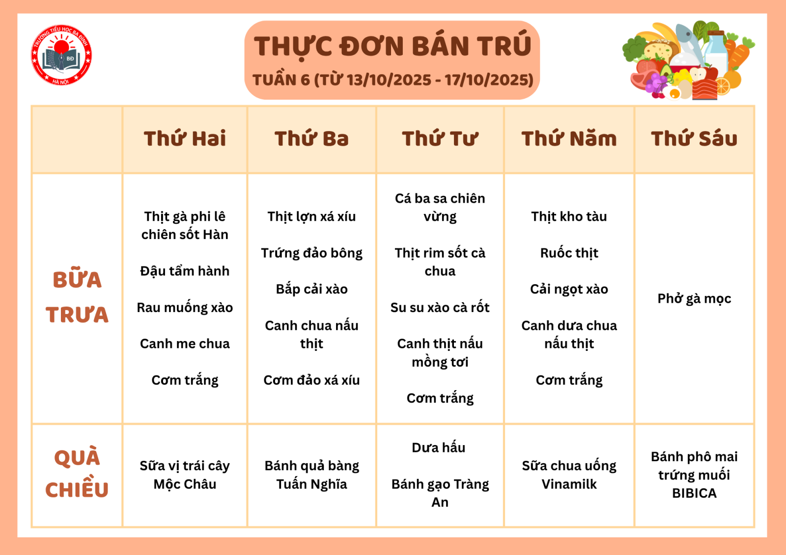 Thực đơn tuần 6 (áp dụng từ 13/10/2025 đến 17/10/2025)