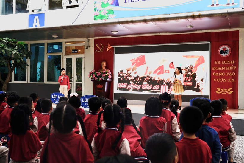 Tiếp theo các bạn học sinh toàn trường cùng ôn lại những thước phim hào hùng của ngày Giải phóng Thủ đô 10/10/1954 và được giao lưu tìm hiểu về "Nét đẹp thanh lịch văn minh của người Hà Nội" qua lời dẫn đầy cuốn hút của 2 bạn Hoàng Trung Anh và Đình Hà Minh Châu lớp 5A2. Sau đó, các bạn còn được tham gia trò chơi “Ai nhanh ai đúng" để thể hiện những kiến thức về thủ Hà Nội mà mình biết và say mê theo dõi các tiết mục văn nghệ múa hát do các bạn học sinh lớp 5A1 và 5A2 chuẩn bị.