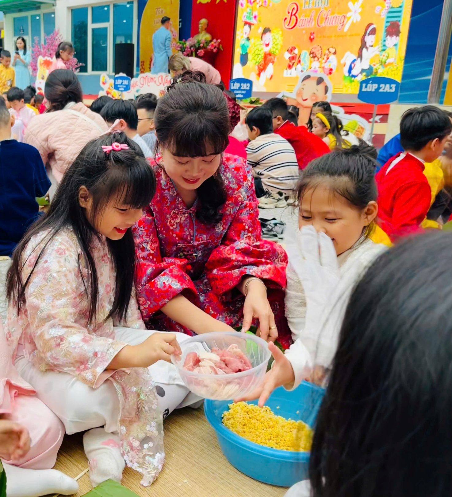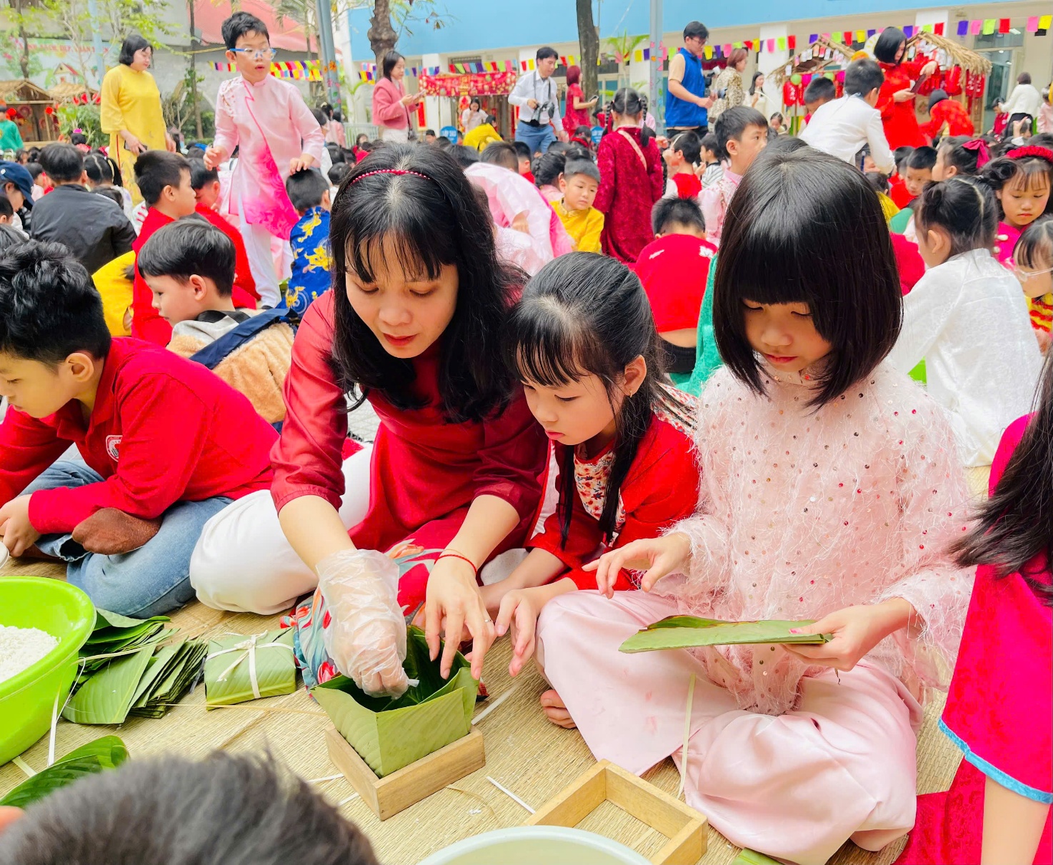 Đối với các em học sinh lớp 2, đây là lần đầu tiên nhiều em được trực tiếp chạm tay vào những nguyên liệu quen thuộc của chiếc bánh chưng truyền thống: lá dong xanh mướt, gạo nếp trắng ngần, đỗ xanh vàng ươm và thịt lợn hồng tươi. Dưới sự hướng dẫn tận tình của thầy cô và các bậc phụ huynh, đặc biệt là sự xuất hiện của nhà giáo Phạm Thị Thiên Nga – cô hiệu trưởng kính yêu trực tiếp hướng dẫn, các em rụt rè nhưng đầy háo hức khi xếp lá, đong gạo, cho nhân bánh. Đôi bàn tay nhỏ nhắn còn vụng về, bánh gói chưa thật vuông vắn, nhưng ánh mắt các em thì ánh lên niềm vui, sự tò mò và tự hào.