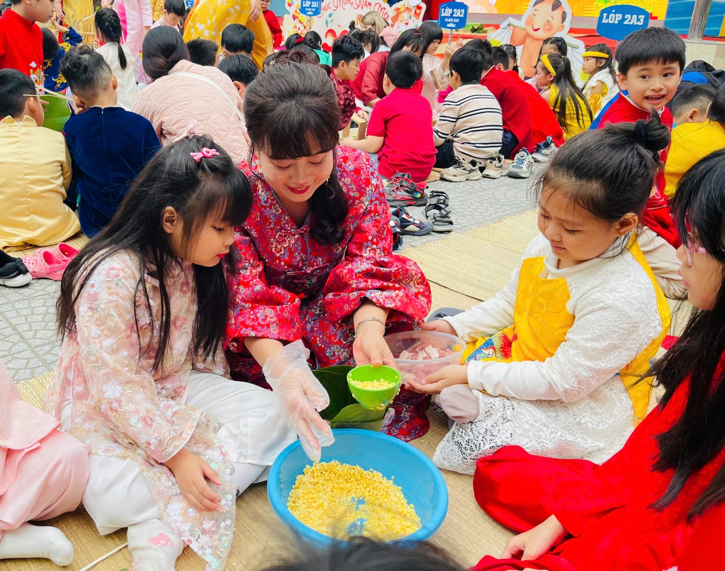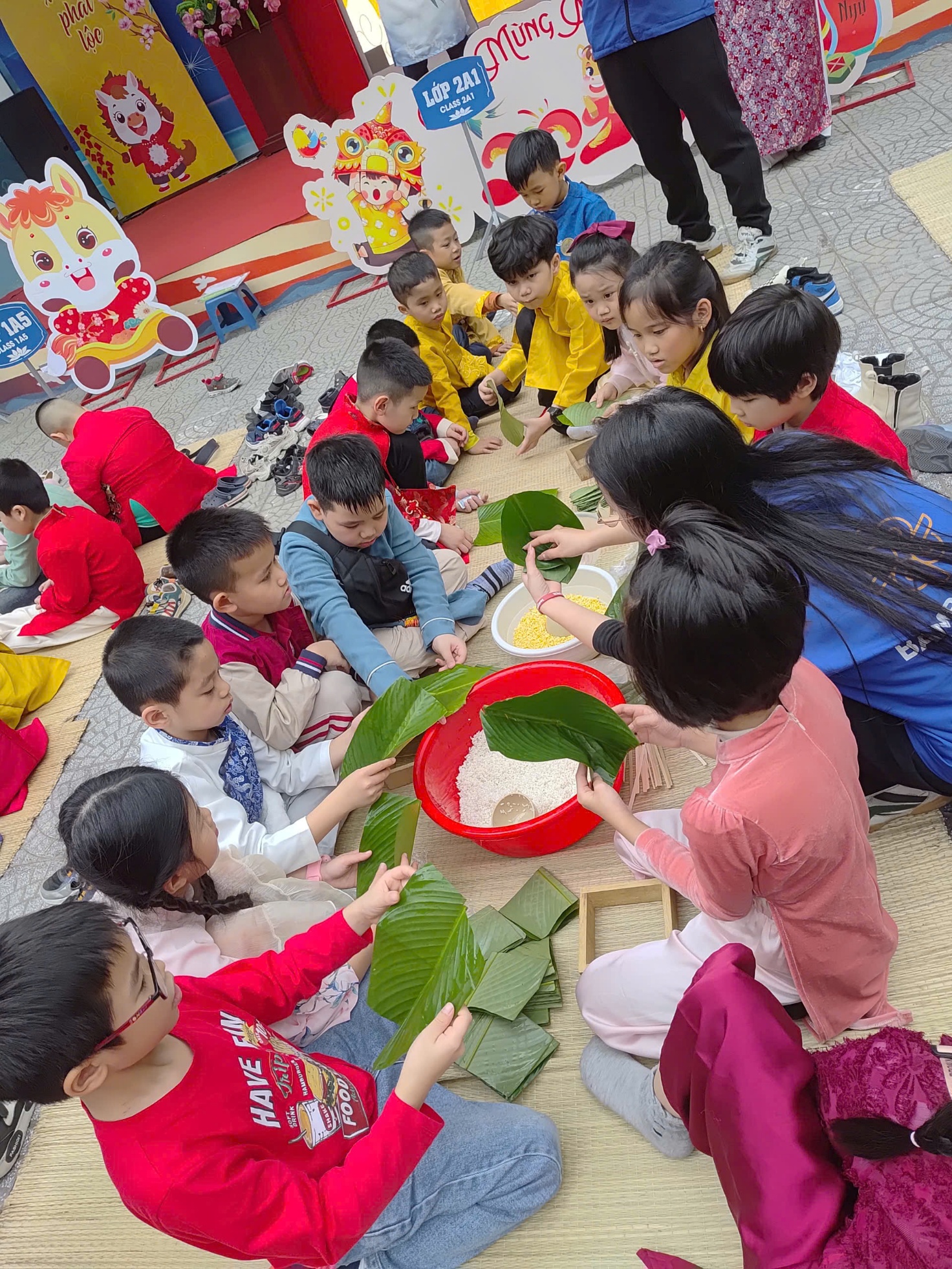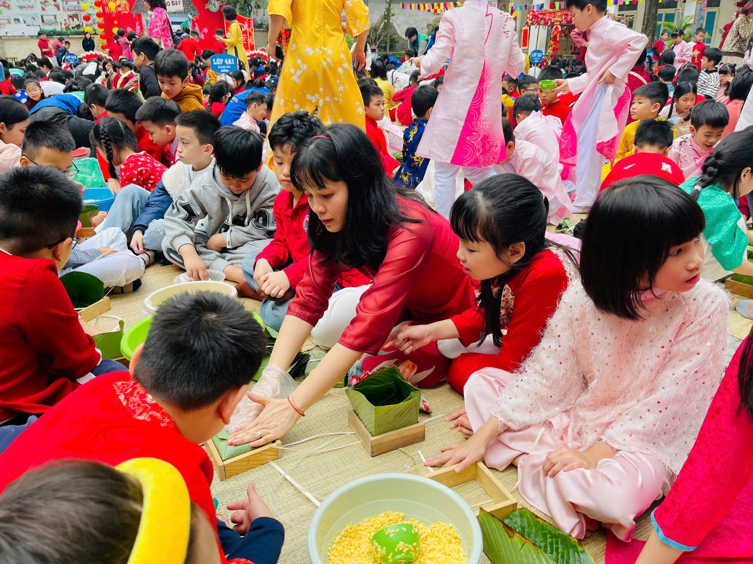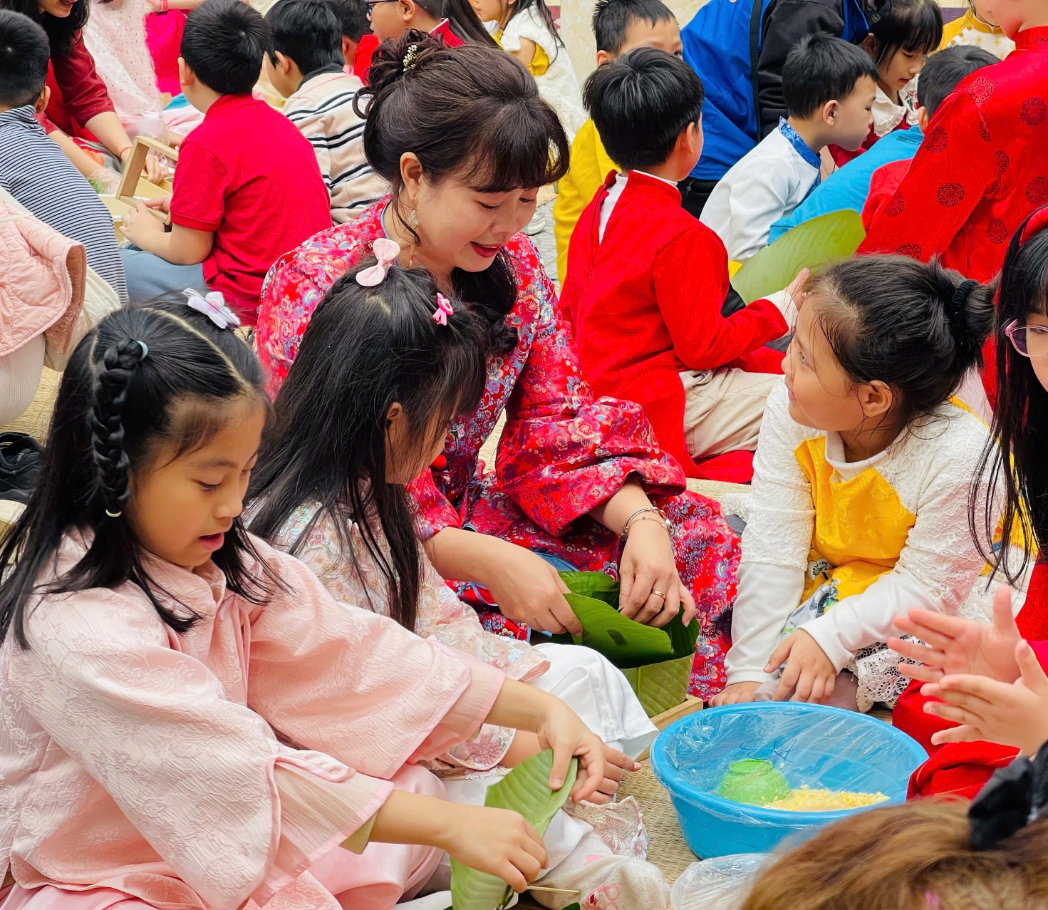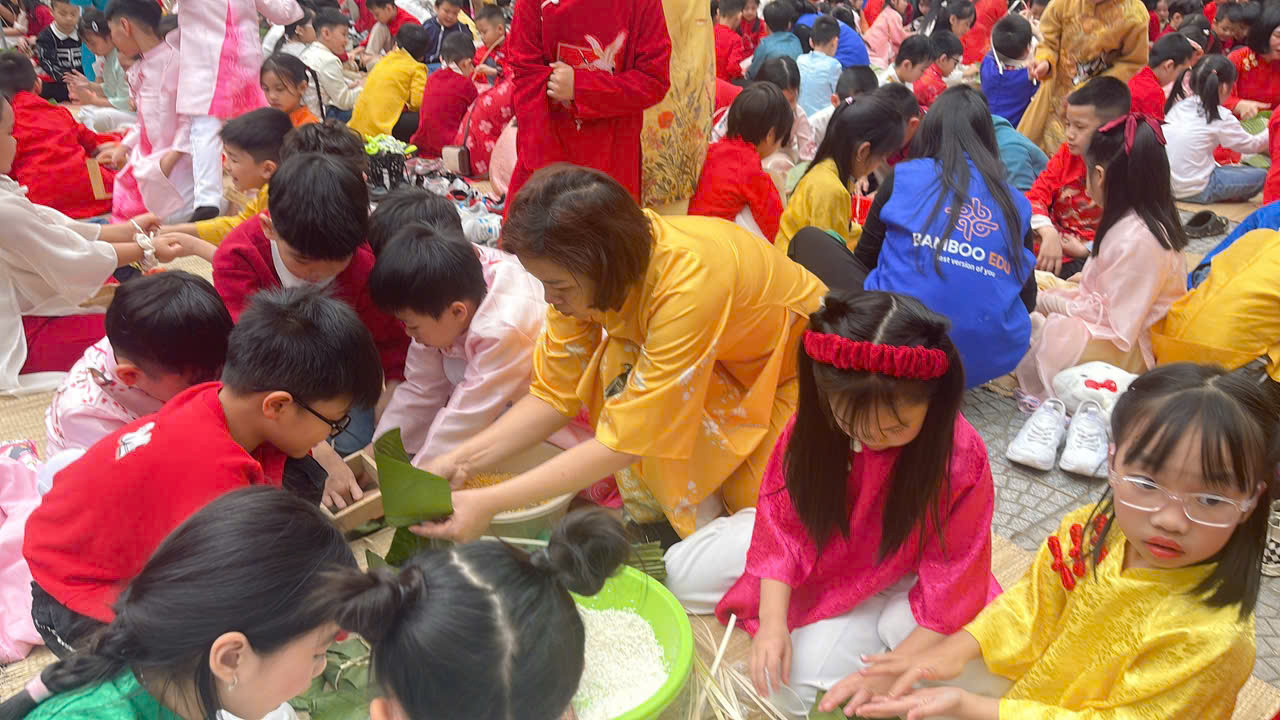 Hoạt động gói bánh chưng không chỉ mang đến niềm vui trải nghiệm mà còn là một bài học sống động về giá trị văn hóa truyền thống của dân tộc. Qua từng thao tác, các em được nghe kể về sự tích bánh chưng, hiểu rằng chiếc bánh không chỉ là món ăn ngày Tết mà còn là biểu tượng của lòng biết ơn, của sự sum họp và yêu thương gia đình. Những bài học ấy được truyền tải một cách tự nhiên, nhẹ nhàng, thông qua chính trải nghiệm thực tế của các em.