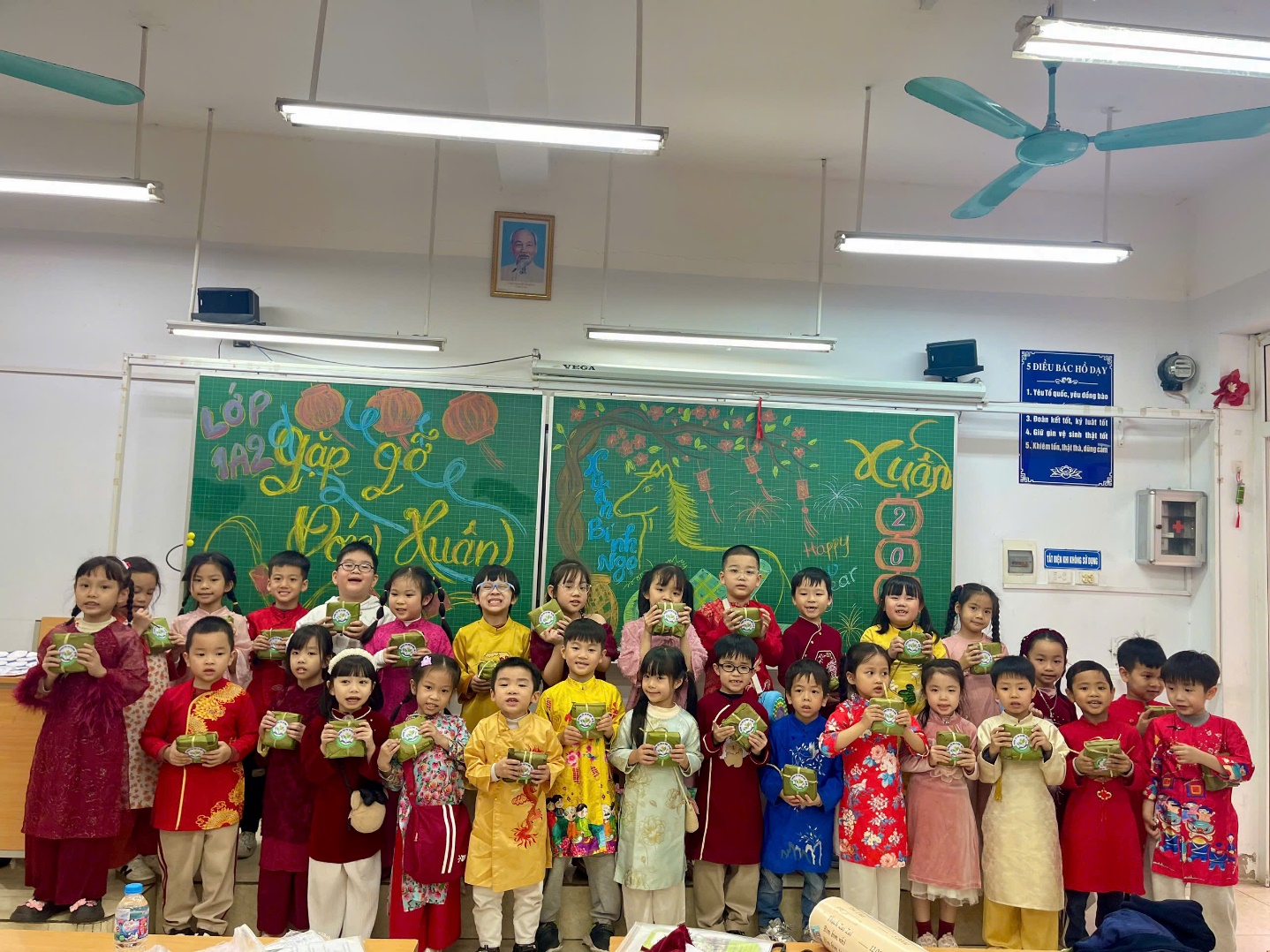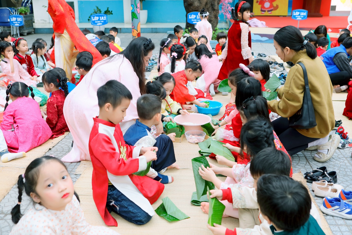 Tại khu vực gói bánh, học sinh lớp 1 được quan sát và tham gia cùng thầy cô, phụ huynh và anh chị hướng dẫn viên trong từng công đoạn làm bánh chưng. Những đôi tay nhỏ nhắn, ánh mắt chăm chú và những câu hỏi ngây thơ đã tạo nên bầu không khí ấm áp, gần gũi.Qua hoạt động này, các em không chỉ hiểu bánh chưng được làm từ đâu mà còn thêm yêu nét đẹp văn hóa dân tộc, trân trọng những giá trị truyền thống được gìn giữ qua bao thế hệ.