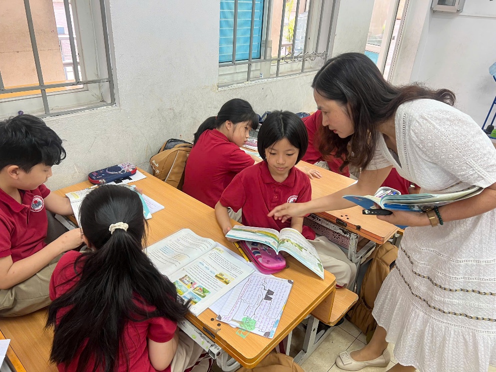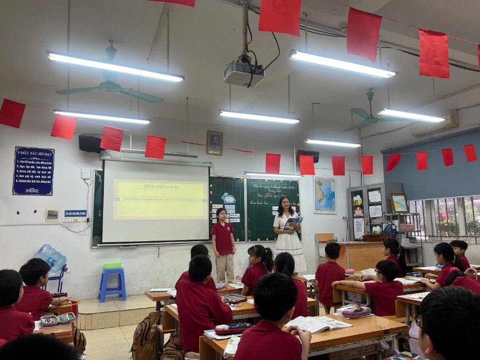 Tiếp đến là hoạt động luyện đọc, các em được thể hiện khả năng đọc to, rõ ràng, biết ngắt giọng, nhấn giọng, đọc hay. Dưới sự hướng dẫn nhẹ nhàng, gần gũi của cô giáo, học sinh không chỉ đọc tốt mà còn hiểu được nội dung, ý nghĩa của bài đọc, qua đó bồi dưỡng tình yêu quê hương đất nước. Trong phần hoạt động tìm hiểu bài, học sinh hào hứng tham gia nhiều hình thức học tập tích cực như thảo luận nhóm, trình bày ý kiến cá nhân, chia sẻ, giao lưu cùng bạn bè. Các em mạnh dạn phát biểu, tự tin chia sẻ suy nghĩ của mình, thể hiện tinh thần học tập chủ động và hợp tác hiệu quả. Tiết học trở nên sôi nổi hơn khi các em được học tập thông qua trò chơi Tiếp sức.