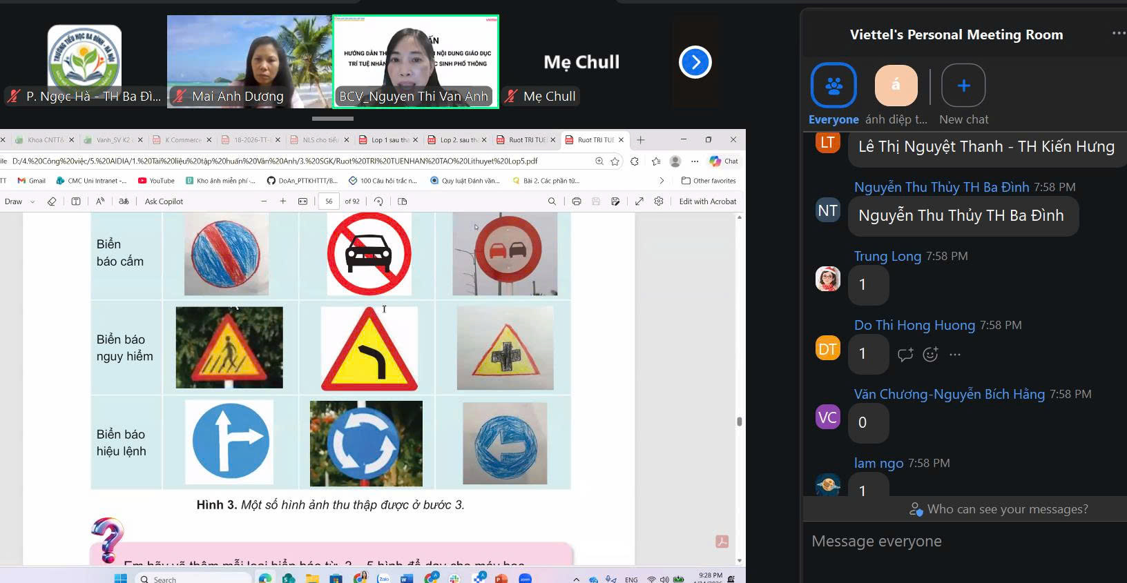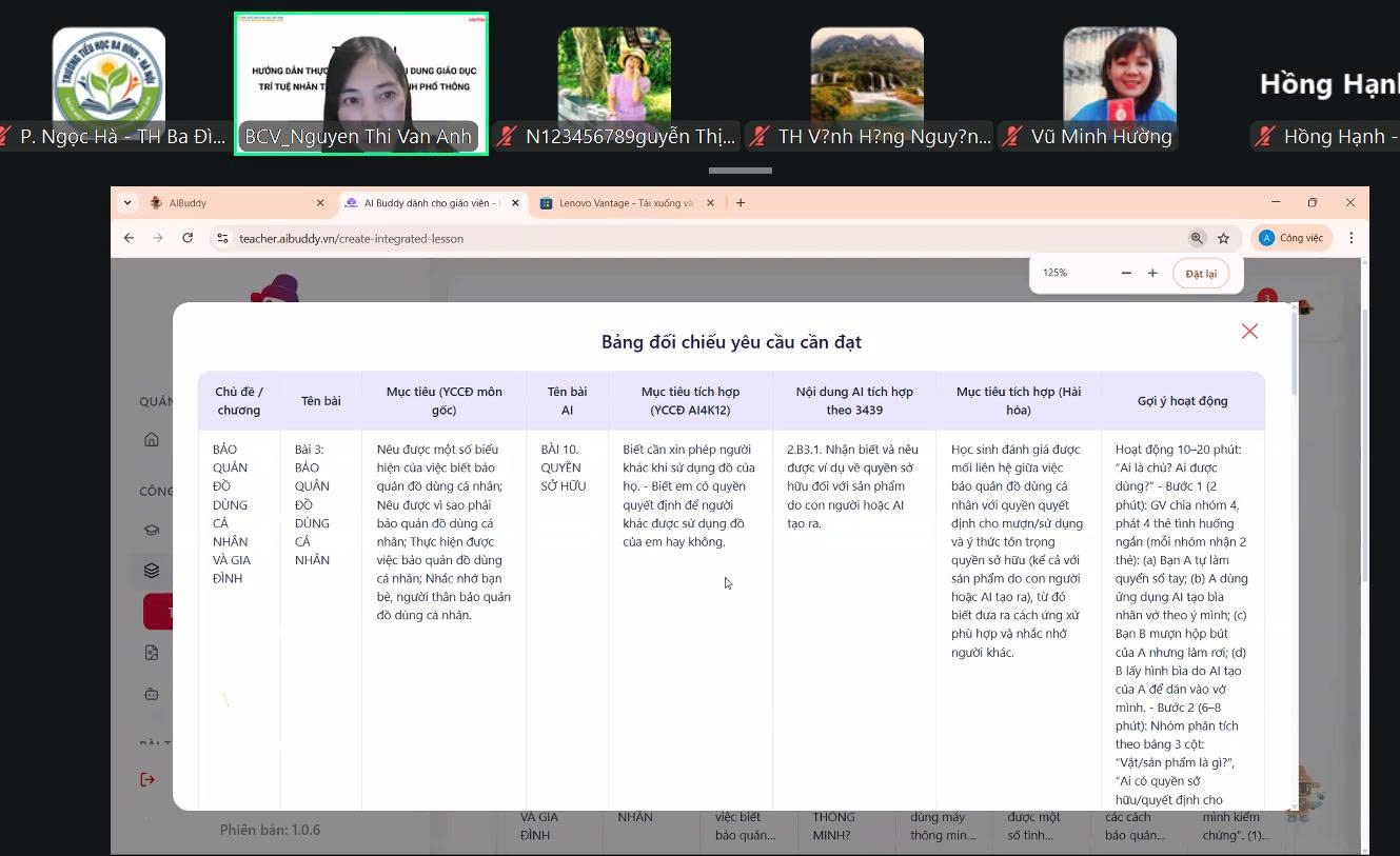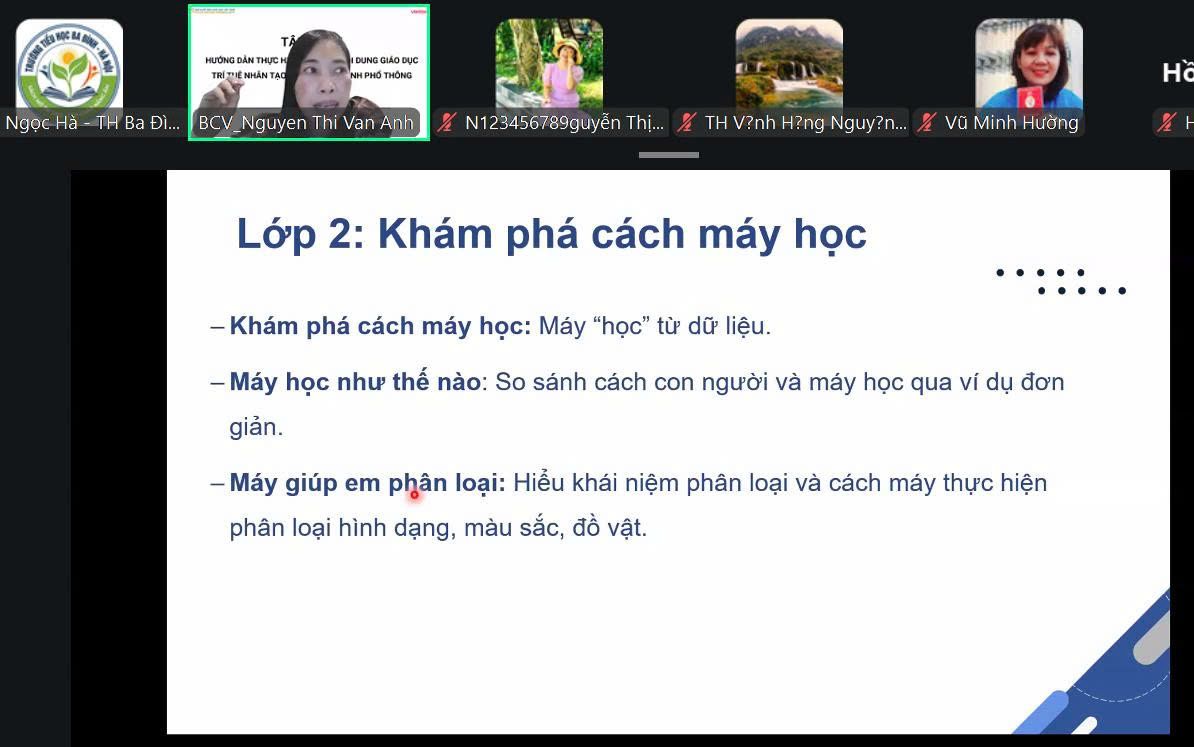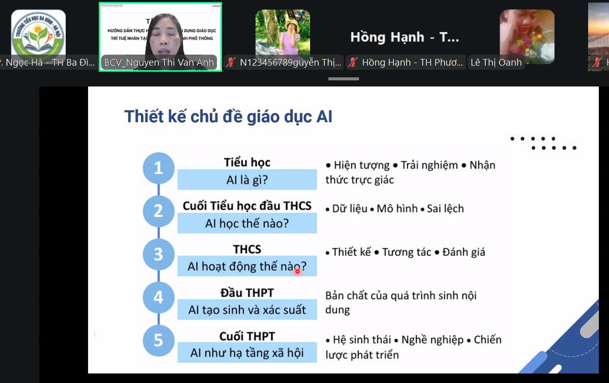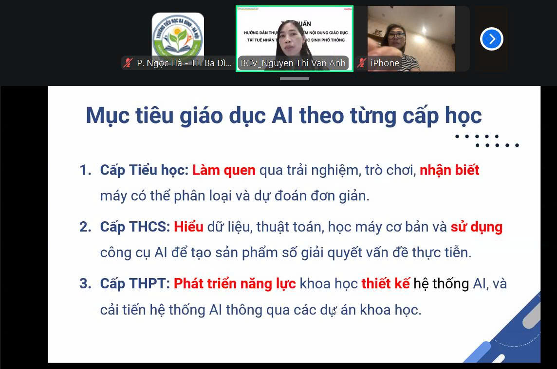 Tại buổi làm việc trực tuyến, báo cáo viên Nguyễn Thị Vân Anh đã trình bày chi tiết về cấu trúc bộ sách Trí tuệ nhân tạo (AI) dành cho học sinh tiểu học. Điểm nổi bật được các giáo viên nhà trường quan tâm chính là cách chuyển hóa những khái niệm công nghệ phức tạp thành những bài học sinh động, gần gũi thông qua các hoạt động trải nghiệm.