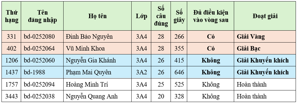 - Giải Vàng: Thuộc top 5%, tối thiểu 27 điểm.