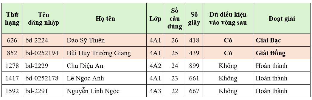 Trường Tiểu học Ba Đình thông báo kết quả Vòng Chung kết cấp khu vực Sân chơi Đấu trường VioEdu – môn Tiếng Anh - năm học 2025 – 2026 – KHỐI 4