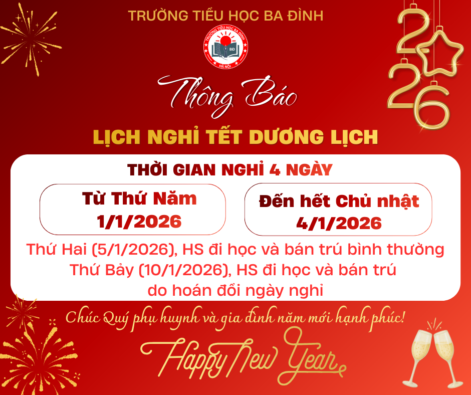 Trường Tiểu học Ba Đình thông báo Lịch nghỉ Tết Dương lịch 2026