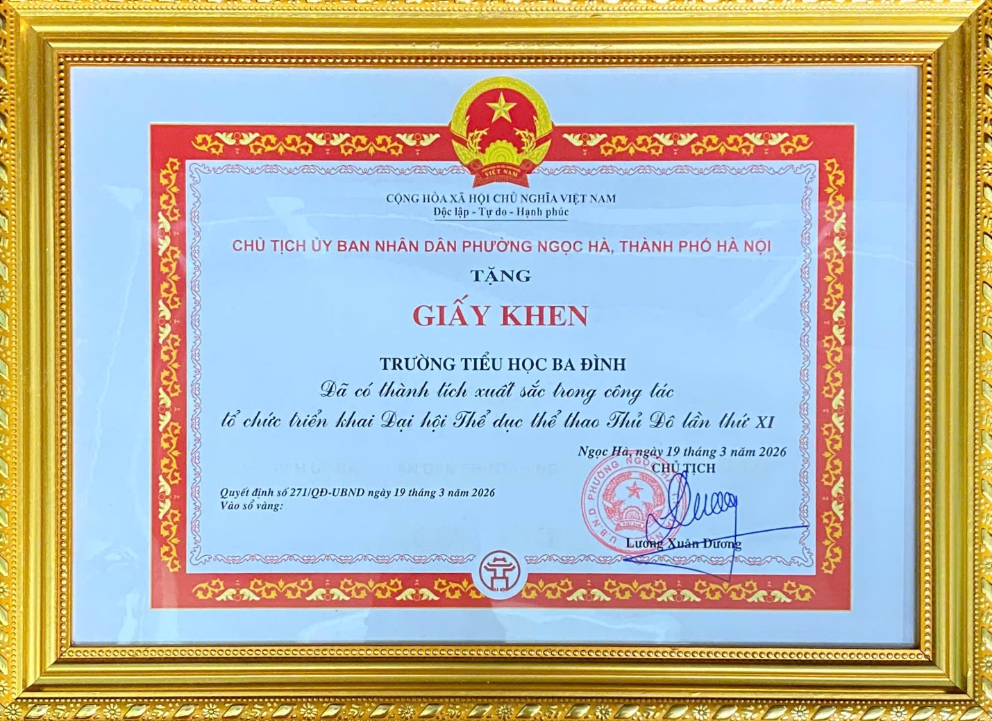 Tại buổi lễ, trường Tiểu học Ba Đình đã tự hào được trao tặng Giấy khen vì đã có thành tích xuất sắc trong công tác tổ chức và triển khai Đại hội Thể dục Thể thao Thủ đô lần thứ XI.