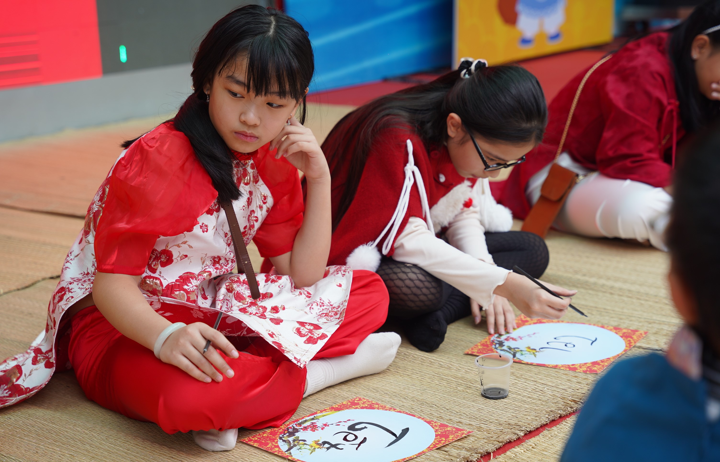 Góc Thư pháp với nét chữ bay bổng, uốn lượn khiến các bạn nhỏ mê mải: