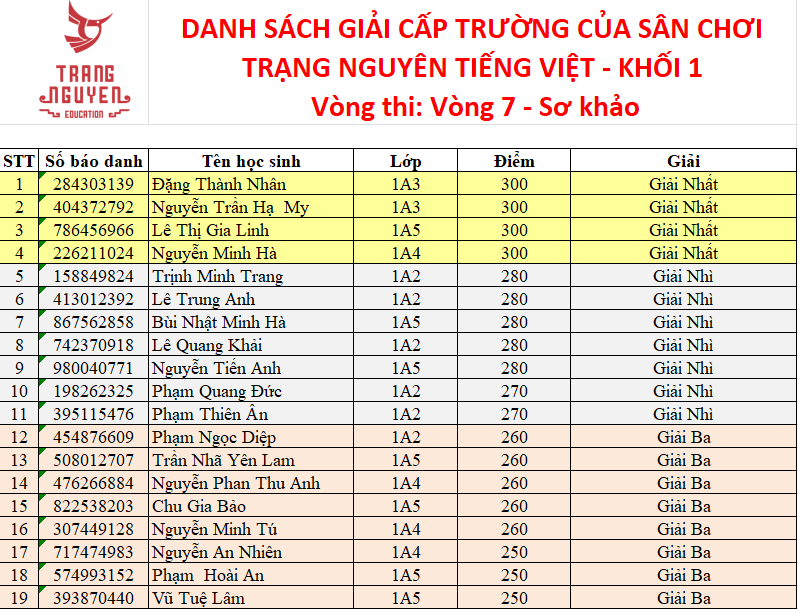 Trường Tiểu học Ba Đình thông báo kết quả Sân chơi Trạng Nguyên Tiếng Việt năm học 2025 - 2026 - Vòng sơ khảo - cấp trường - Khối 1