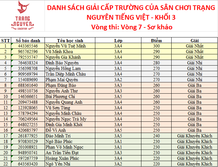 Trường Tiểu học Ba Đình thông báo kết quả Sân chơi Trạng Nguyên Tiếng Việt năm học 2025 - 2026 - Vòng sơ khảo - cấp trường - Khối 3
