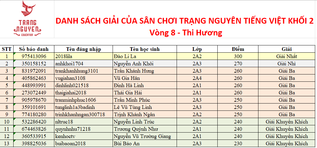 Trường Tiểu học Ba Đình thông báo kết quả Sân chơi Trạng Nguyên Tiếng Việt năm học 2025 - 2026 - Vòng sơ khảo - cấp trường - Khối 2