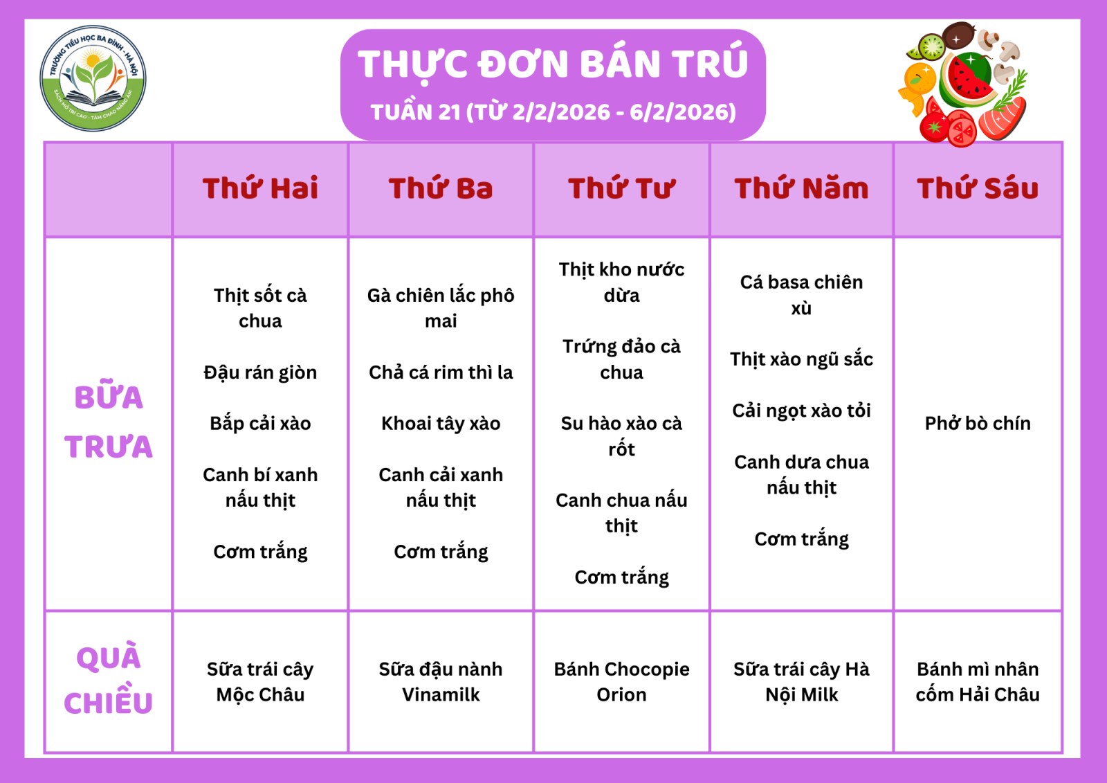 Thực đơn bán trú tuần 21 (áp dụng từ 2/2/2026 đến 6/2/2026)