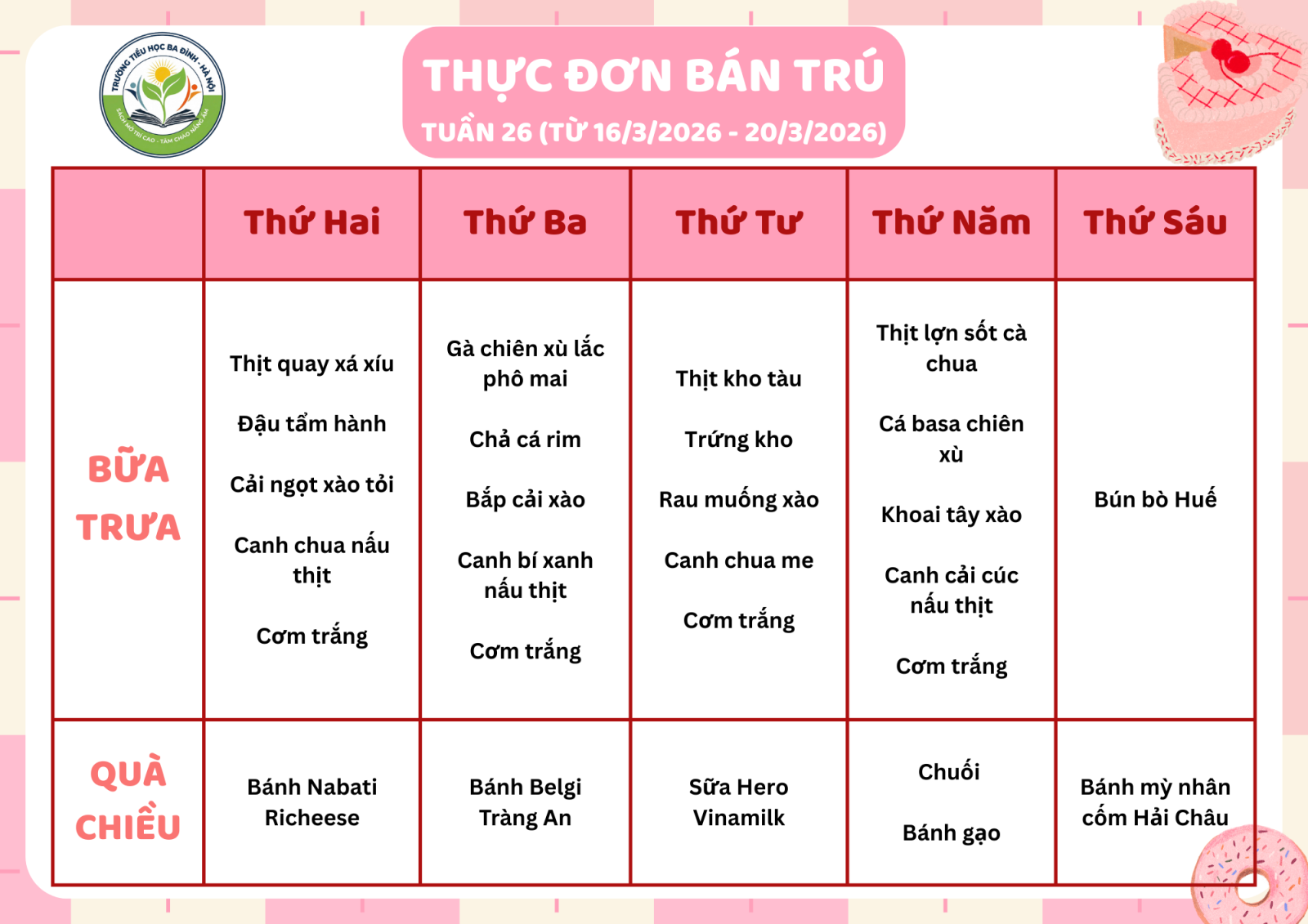 Thực đơn bán trú tuần 26 (áp dụng từ 16/3/2026 đến 20/3/2026)