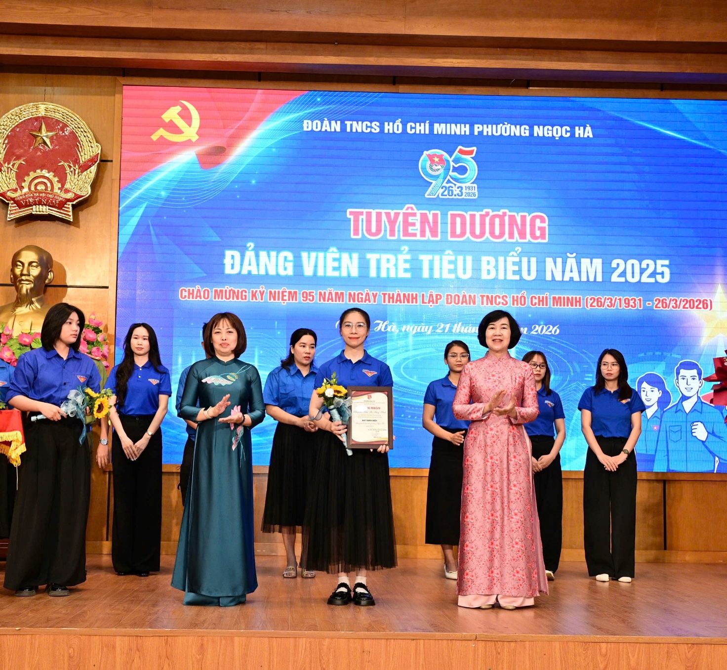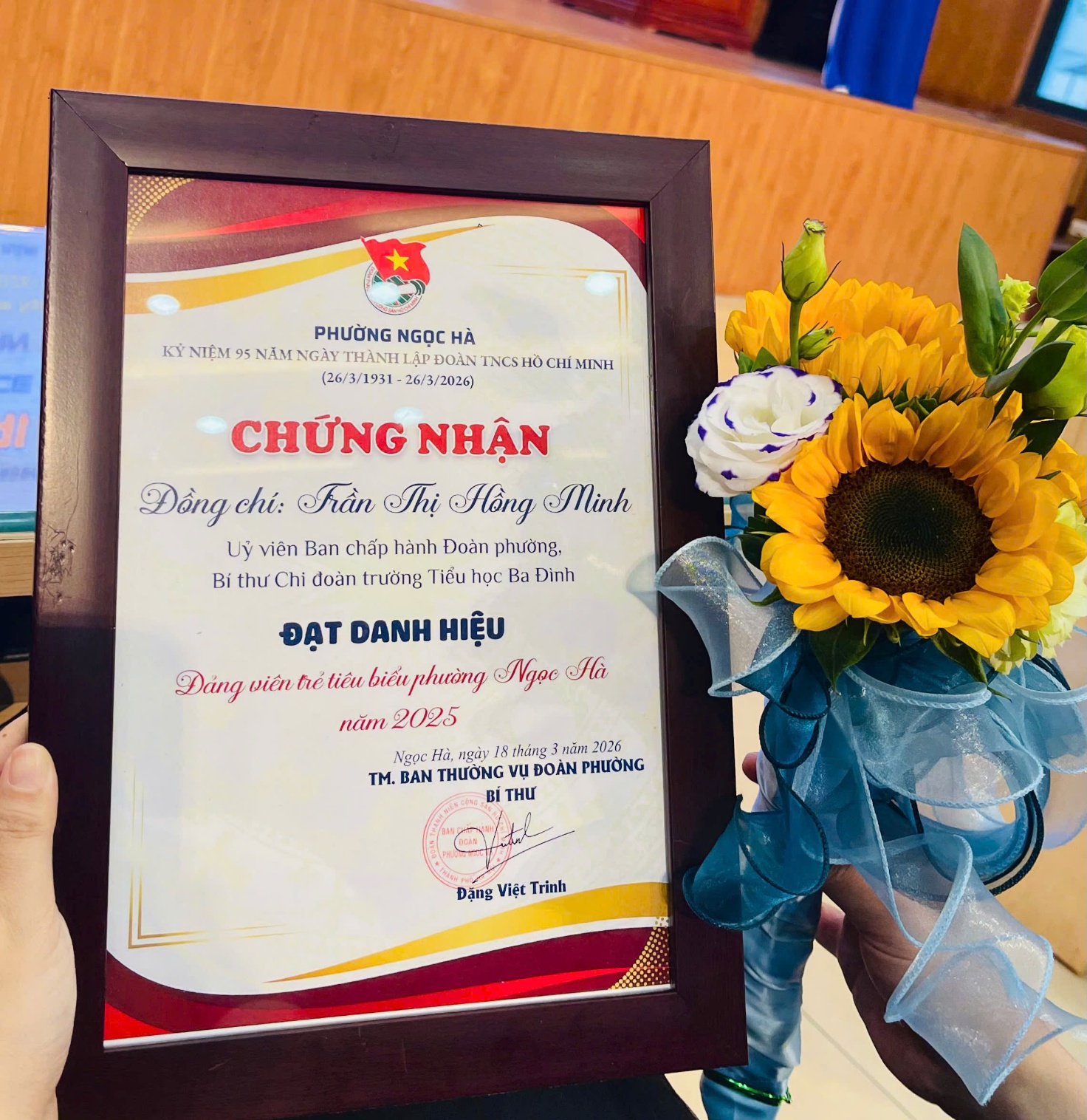 Trong chuỗi hoạt động ý nghĩa ấy, tại buổi lễ kỷ niệm 95 năm ngày thành lập Đoàn TNCS Hồ Chí Minh (26/3/1931 – 26/3/2026), đồng chí Bí thư Trần Thị Hồng Minh đã vinh dự được tuyên dương là Đảng viên trẻ tiêu biểu phường Ngọc Hà năm 2025. Đây là niềm tự hào lớn, đồng thời là động lực để chi đoàn tiếp tục phát huy tinh thần xung kích, sáng tạo, góp phần xây dựng nhà trường ngày càng vững mạnh.
