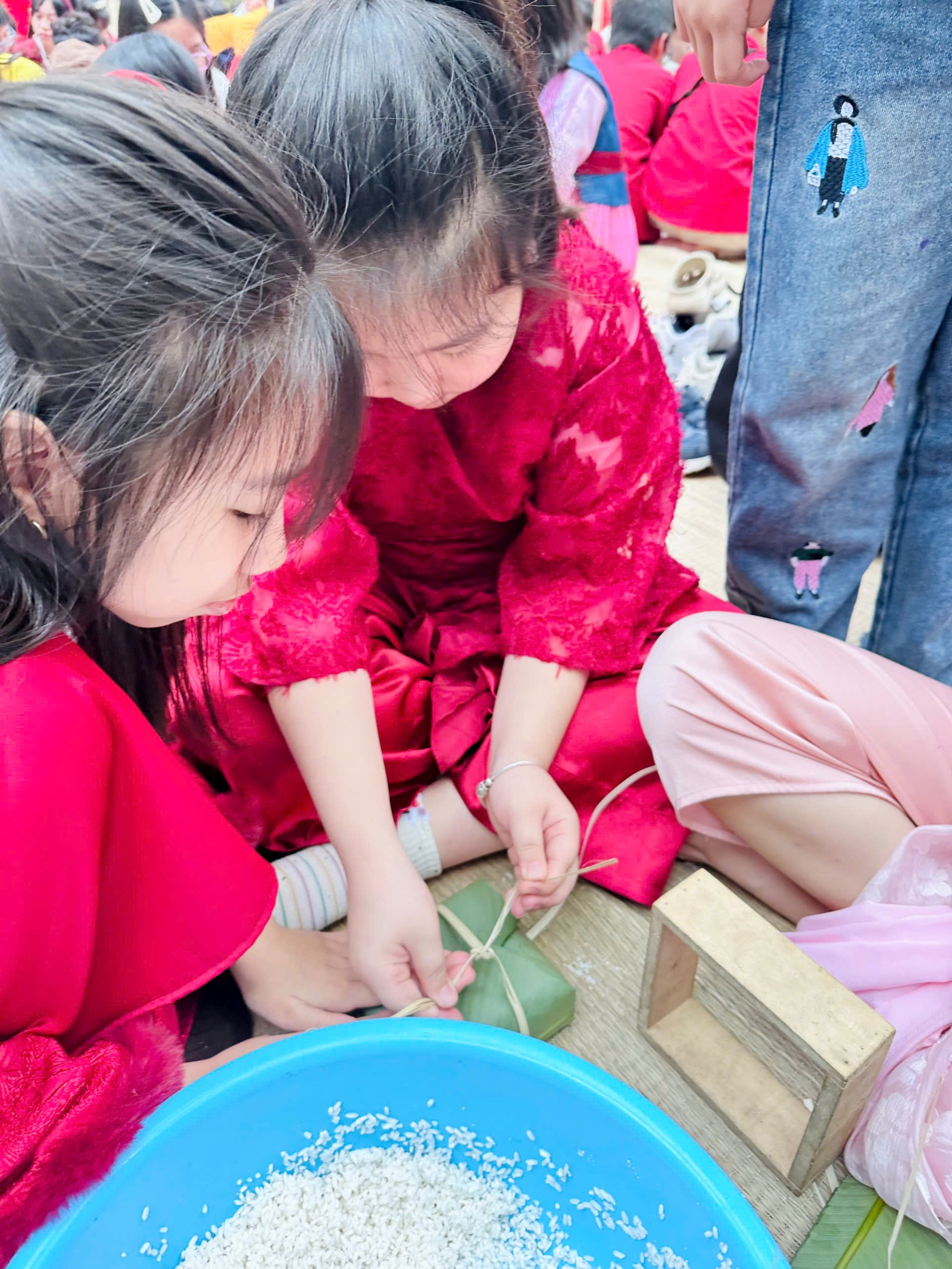 Tại ngày hội, học sinh hào hứng tham gia hoạt động gói bánh chưng truyền thống – biểu tượng quen thuộc của ngày Tết Việt Nam. Từ những chiếc lá dong xanh mướt, hạt gạo trắng ngần, đỗ vàng thơm bùi đến miếng thịt hồng tươi, tất cả được các em nâng niu, sắp xếp cẩn thận dưới sự hướng dẫn tận tình của thầy cô. Mỗi chiếc bánh không chỉ là sản phẩm lao động mà còn chứa đựng niềm vui, sự khéo léo và tình cảm dành cho Tết sum vầy.