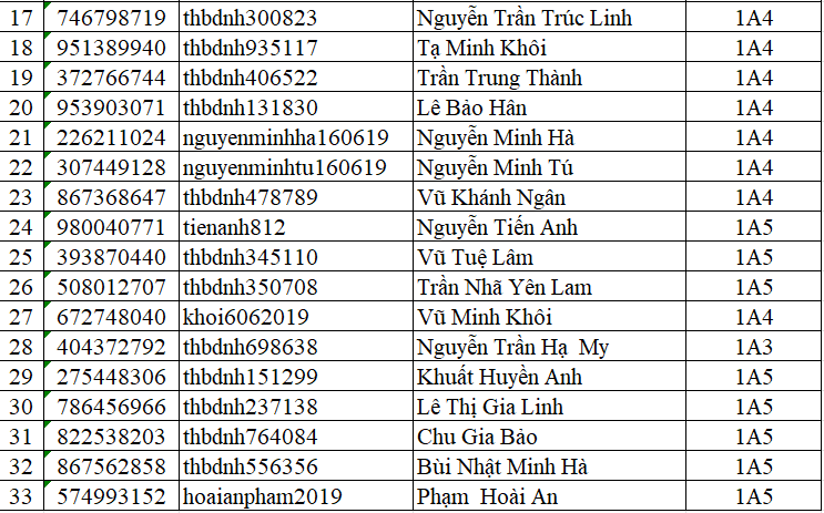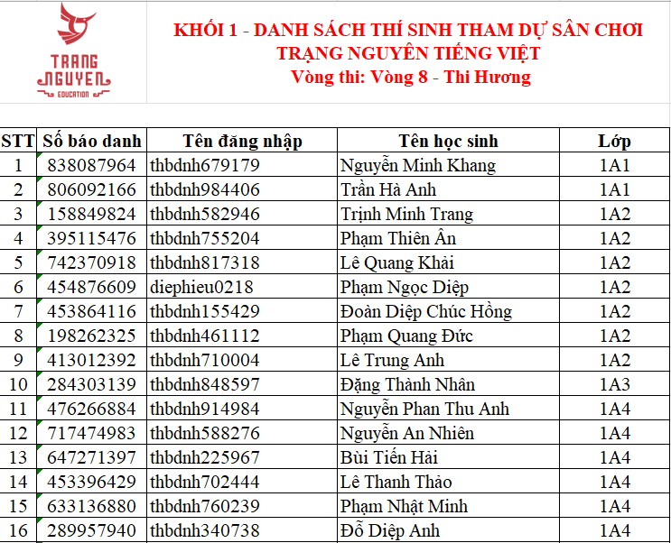 Trường Tiểu học Ba Đình thông báo Danh sách học sinh tham gia Sân chơi Trạng Nguyên Tiếng Việt năm học 2025 - 2026 - Vòng thi Hương - Khối 1