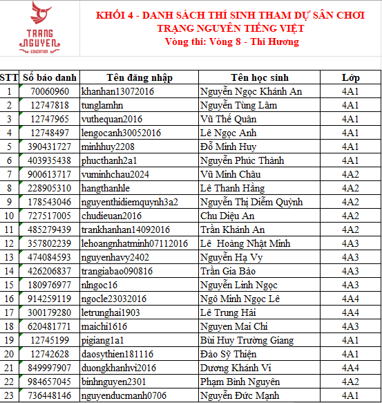 Trường Tiểu học Ba Đình thông báo Danh sách học sinh tham gia Sân chơi Trạng Nguyên Tiếng Việt năm học 2025 - 2026 - Vòng thi Hương - Khối 4