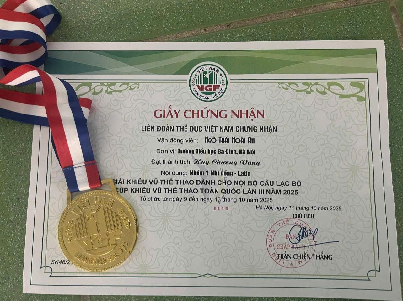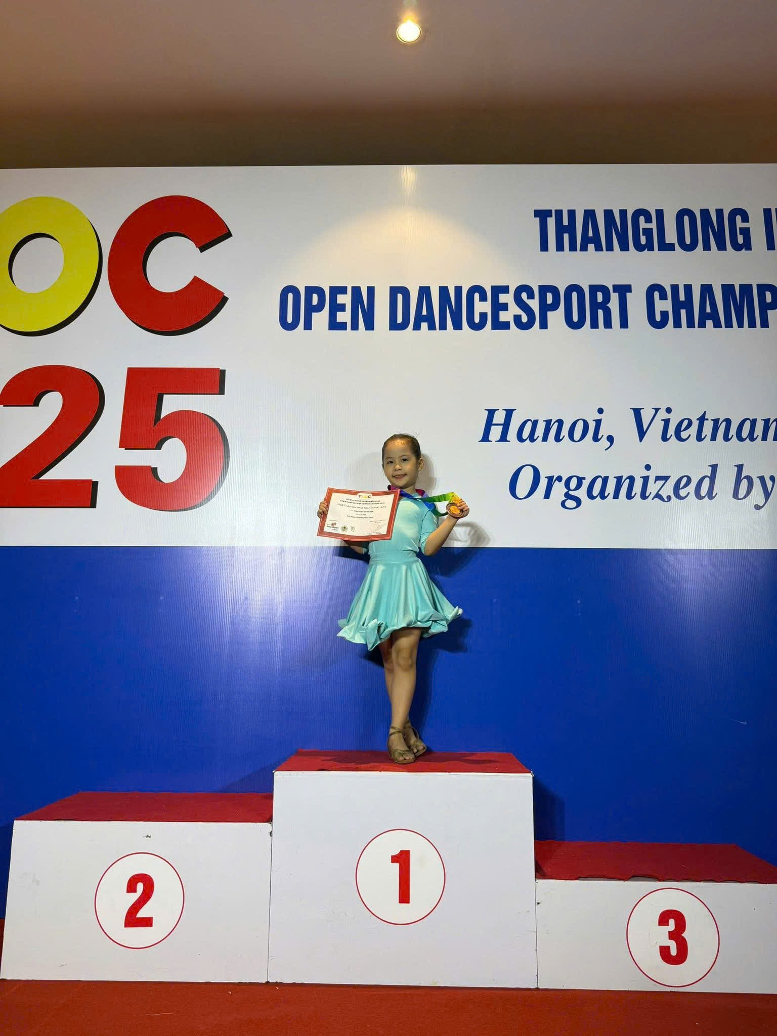 Trong không khí rực rỡ và đầy kịch tính của Giải Khiêu vũ Thể thao Hà Nội mở rộng và Giải Vô địch Quốc gia 2025, em Ngô Thái Hoài An – học sinh lớp 2A3, Trường Tiểu học Ba Đình – đã xuất sắc chinh phục tấm Huy chương Vàng danh giá, trở thành niềm tự hào lớn lao của nhà trường và gia đình.